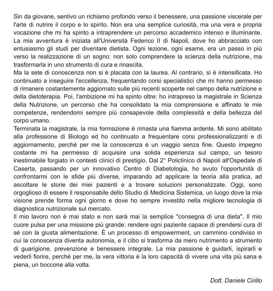 Il Doc Cirillo, è un professionista molto competente, empatico e simpatico. Entra immediatamente in relazione con il paziente, mettendolo a proprio agio. Con la sua precisa analisi a 360°, riesce ad evidenziare tutti gli aspetti relativi al vissuto del paziente su cui intervenire, per poter raggiungere un maggior stato di benessere, superando i problemi attuali... Mi ha preparato una dieta personalizzata in base alle mie problematiche, metabolismo lento... insieme abbiamo trovato il giusto equilibrio nutrizionale.