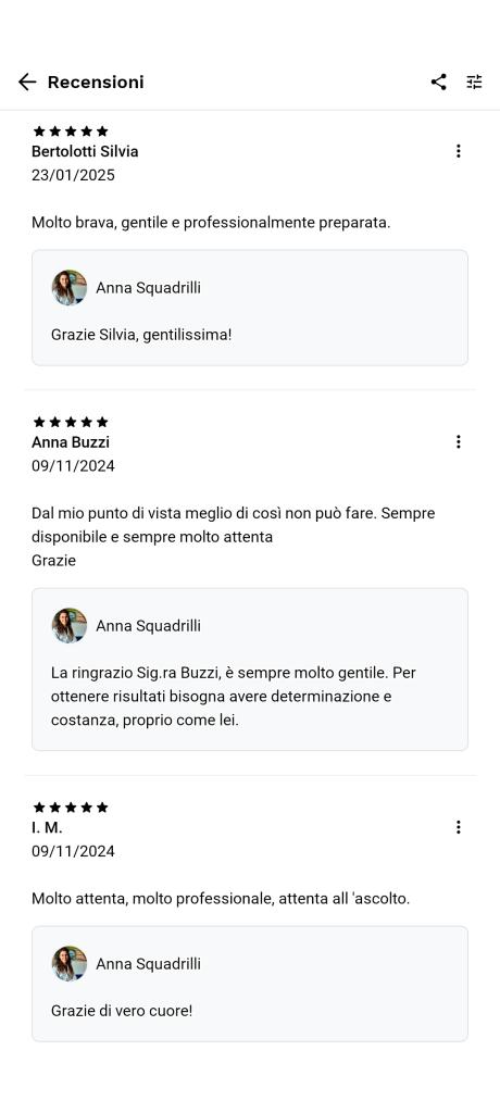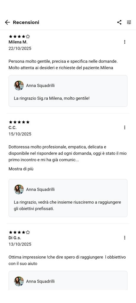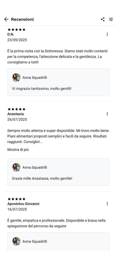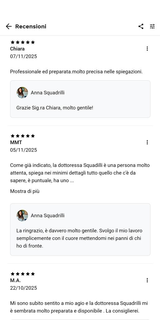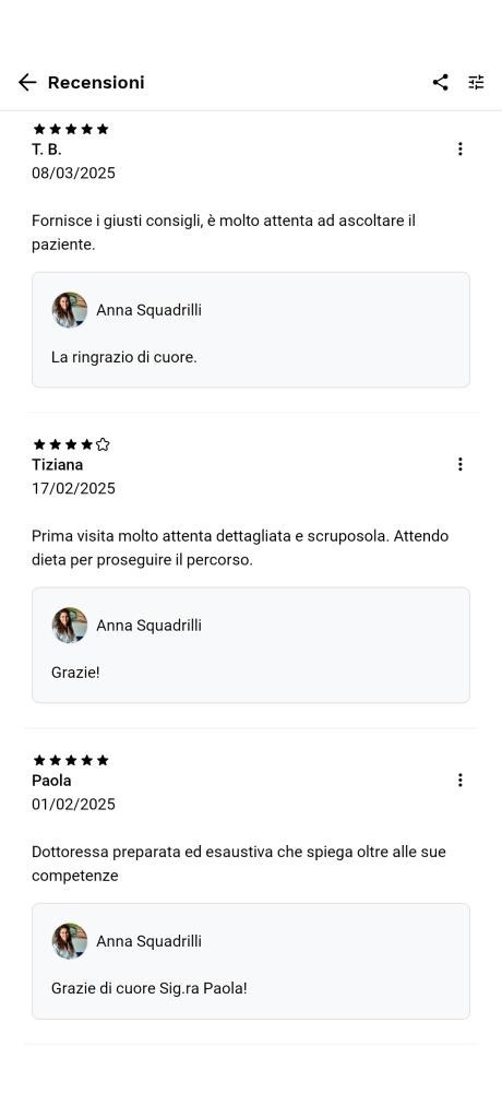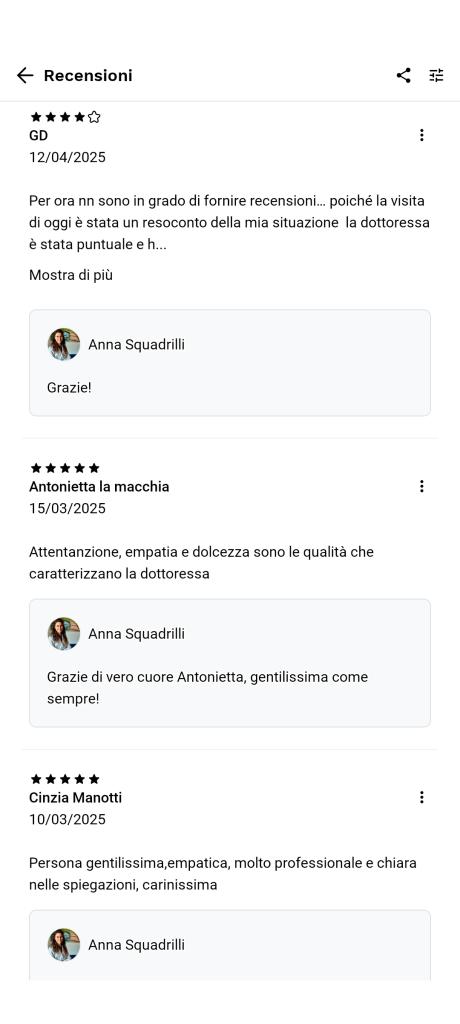 Riesco a costruire una relazione empatica con i miei pazienti e sono sempre a loro disposizione, anche a distanza, per semplici curiosità, consigli o per un supporto morale.